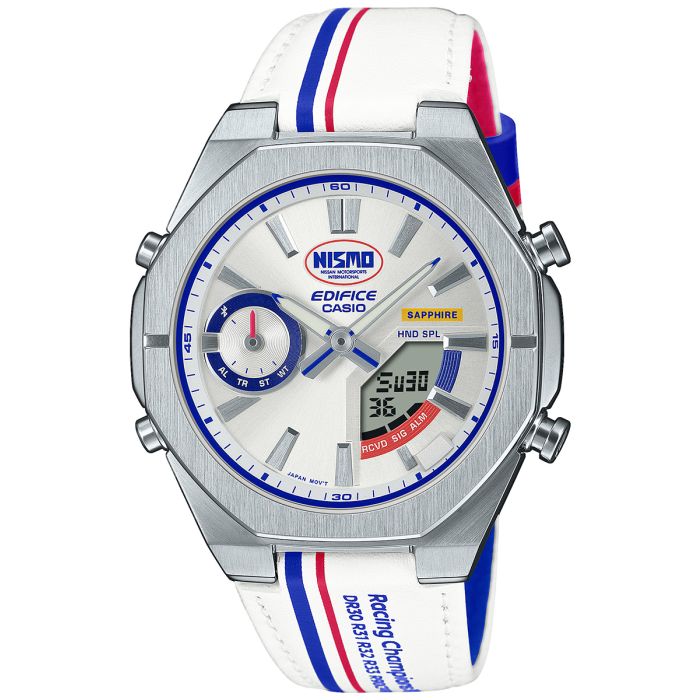 Casio EDIFICE ECB-S10NIS-7AER posiada kopertę o średnicy 43 mm, która doskonale prezentuje się na nadgarstku, łącząc sportowy charakter z eleganckim wykończeniem. Pasek zegarka ozdobiony jest unikalnymi detalami – wewnętrzna strona nawiązuje do barw zespołu NISMO, a na powierzchni widnieją nazwiska mistrzów z lat 1984–1997. Z kolei szlufka paska została zaprojektowana na wzór oryginalnego uniformu NISMO. Te detale sprawiają, że zegarek jest nie tylko narzędziem pomiaru czasu, ale także kolekcjonerskim hołdem dla motorsportu.