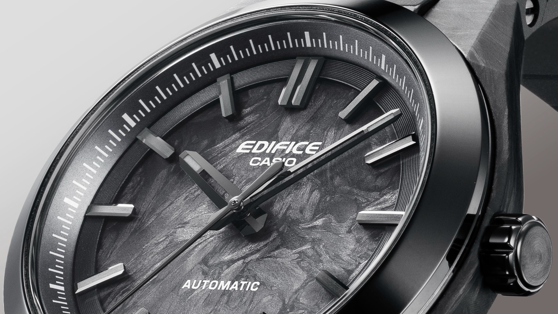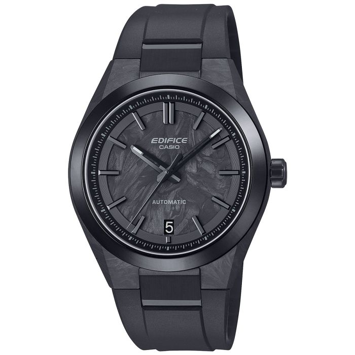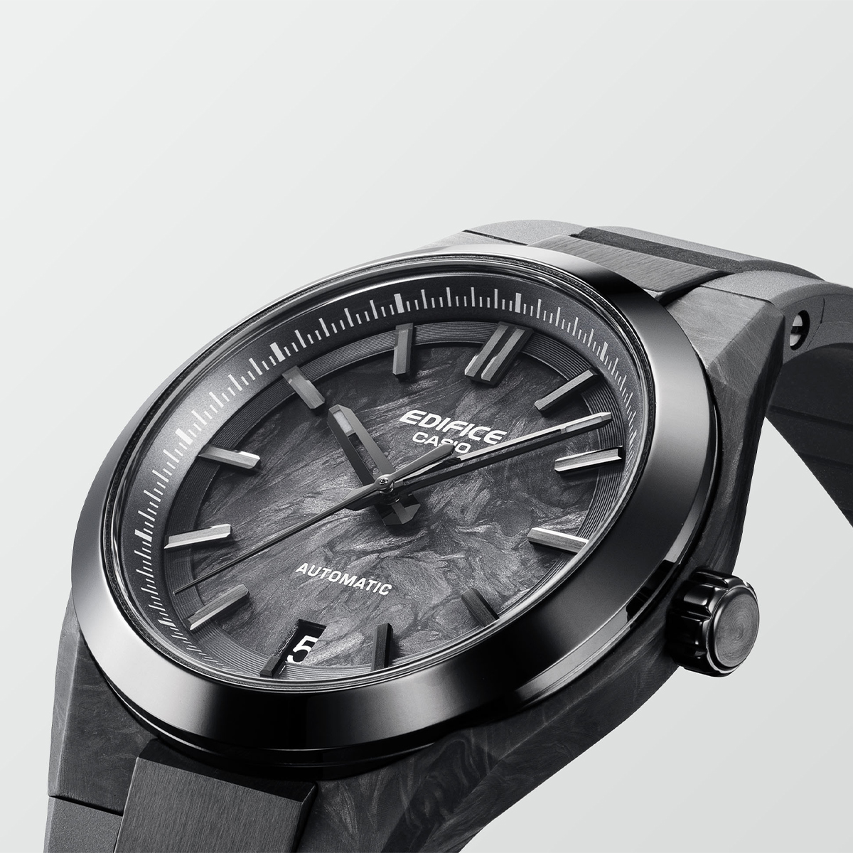 Model EFK-100XPB-1AER został wyposażony w tarcza wykonaną z kutego karbonu, co sprawia, że każdy egzemplarz ma unikalny, nieregularny wzór. Sportowy charakter zegarka podkreślają proste indeksy, datownik oraz powłoka Neobrite, która umożliwia wygodne odczytanie godziny nawet w ciemności. Całość chroniona jest szkłem szafirowym, znanym z wysokiej odporności na zarysowania – to rozwiązanie zapewniające długotrwałą przejrzystość i elegancki wygląd