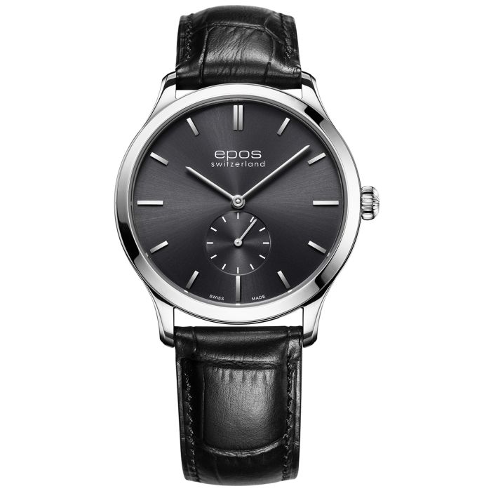 W porównaniu do innych męskich zegarków koperta tego czasomierza Epos jest stosunkowo cienka – jej grubość wynosi 6 mm. Dzięki temu zegarek schowa się pod mankietem i będzie widoczny dopiero wtedy, gdy wyciągniesz po coś rękę. Dodatkowo zapobiega to nieestetycznemu zahaczaniu koszuli o kopertę. Została wykonana ze stali szlachetnej w srebrnym kolorze. Doskonale komponuje się ona z czarnym, skórzanym paskiem. To połączenie to kwintesencja męskiej elegancji.