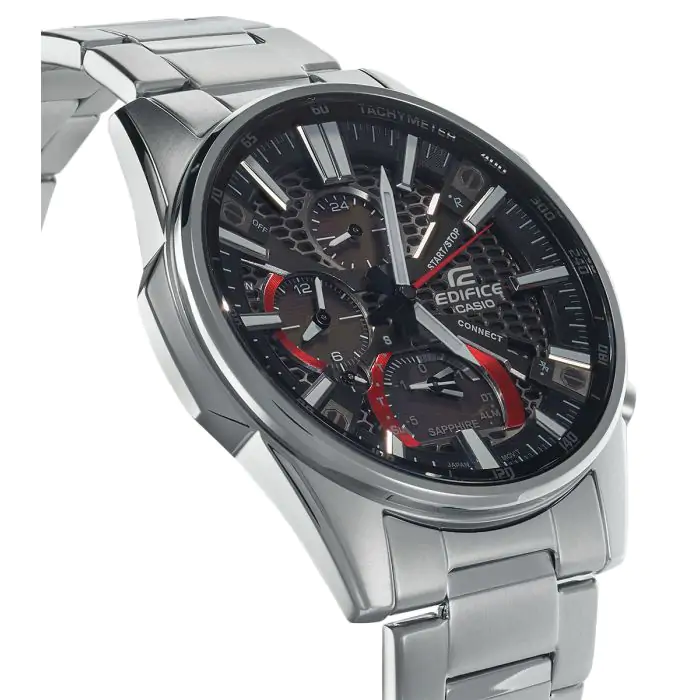 Zegarek męski Casio Edifice EQB-1200D-1AER został stworzony z myślą o mężczyznach poszukujących zegarka o wyjątkowym designie, który łączy wysoką jakość wykonania z najnowszą technologią. Wykończenie tego modelu ukazuje nam perfekcję w każdym calu oraz pasję z jaką został zaprojektowany przez japońskich inżynierów. Kopertę oraz bransoletę z pełnych ogniw z bezpiecznym zapięciem wykonano z wysokiej jakości stali szlachetnej, która nie ulega korozji. Cyferblat został zagospodarowany w minimalistyczny sposób. Tarcza została oznaczona indeksami o wyrazistej bryle co sprawia, że jest przejrzysta i czytelna. Model ten korzysta z technologii Tough Solar, która poprzez wbudowane panele słoneczne zasila zegarek energią ze światła i zapobiega konieczności wymiany baterii. Dodatkowym atutem jest technologia Bluetooth®, która w tej wersji potrzebuje 70% mniej energii do działania. Dzięki synchronizacji zegarek łączy się ze smartfonem, umożliwiając dostęp do kilku użytecznych opcji. Wśród nich jest funkcja synchronizacji czasu z czasem ustawionym w naszym urządzeniu, funkcja czasu światowego oraz możliwość ustawienia godziny w drugiej strefy czasowej na mniejszej tarczy. Na szczególną uwagę zasługuje funkcja zagubiony telefon, która pozwala użyć odpowiedniego przycisku w zegarku, aby ukryty przed naszym wzrokiem telefon wydał z siebie dźwięki. Model ten posiada automatyczny kalendarz, który ustawiony raz zawsze wskaże właściwą datę, bez względu na krótsze miesiące. Wodoszczelność klasy 100M pozwala na swobodne pływanie i nurkowanie bez akwalungu. Tachometr znajdujący się na bezelu zegarka podkreśla sportowy charakter tego czasomierza.