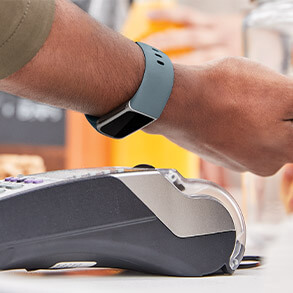 Dodaj kartę kredytową lub debetową do portfela w aplikacji Fitbit, a następnie płać zbliżeniowo trackerem Fitbit Charge 5 w kawiarni, sklepie lub na stacji. Nie musisz już mieć ze sobą telefonu ani portfela.