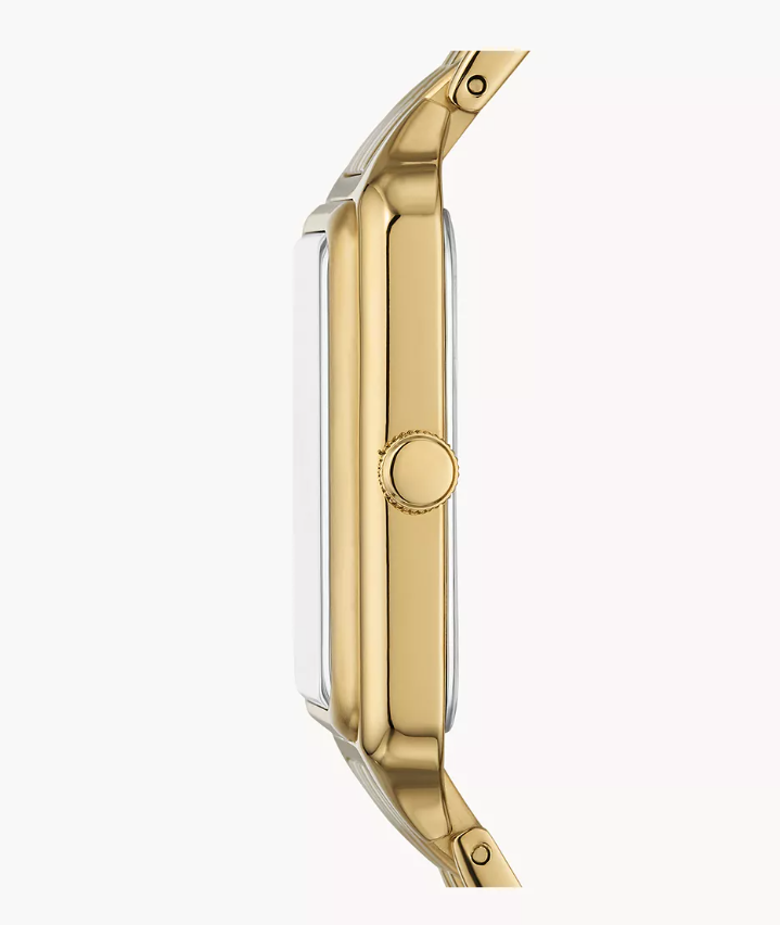 Złota stalowa koperta o kształcie prostokątnym dodaje zegarkowi luksusowego wyglądu. Wodoszczelność na poziomie 50 m pozwala na użytkowanie w różnych warunkach, choć zaleca się unikanie długotrwałego kontaktu z wodą. Bransoleta ze złotej stali szlachetnej, wyposażona w zatrzaskowe zabezpieczenie, jest nie tylko estetyczna, ale także trwała i odporna na korozję.