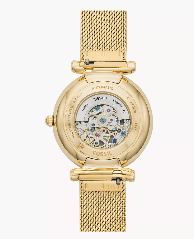 Złota stalowa koperta o okrągłym kształcie tworzy harmonijny wygląd zegarka. Wodoszczelność na poziomie 5 ATM pozwala na zachlapanie czy mycie rąk, jednak zanurzenie w wodzie lepiej unikać. Bransoleta typu mesh (mediolańska) w złotym kolorze jest nie tylko stylowym elementem, ale również zapewnia samodzielną regulację długości, dzięki zastosowanemu zapięciu G-Link.