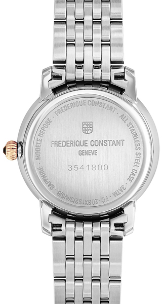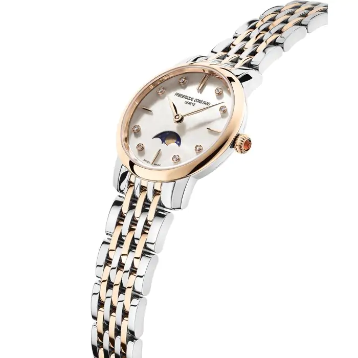 Uniwersalny zegarek Frederique Constant Slimline Ladies Moonphase oferowany jest na bransolecie wykonanej ze stali szlachetnej, w odcieniu złotego różu, zapewniając bezproblemowe i bezpieczne użytkowanie czasomierza przez bardzo długi czas. Koperta i bransoleta reprezentują harmonię między pięknem, a funkcjonalnością, tworząc czasomierz, który spełnia oczekiwania w kwestii zarówno wyglądu, jak i wydajności.