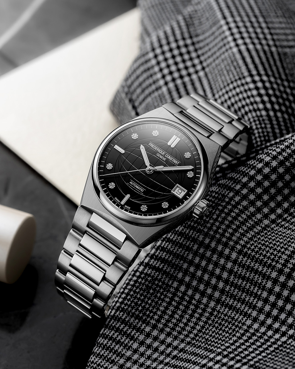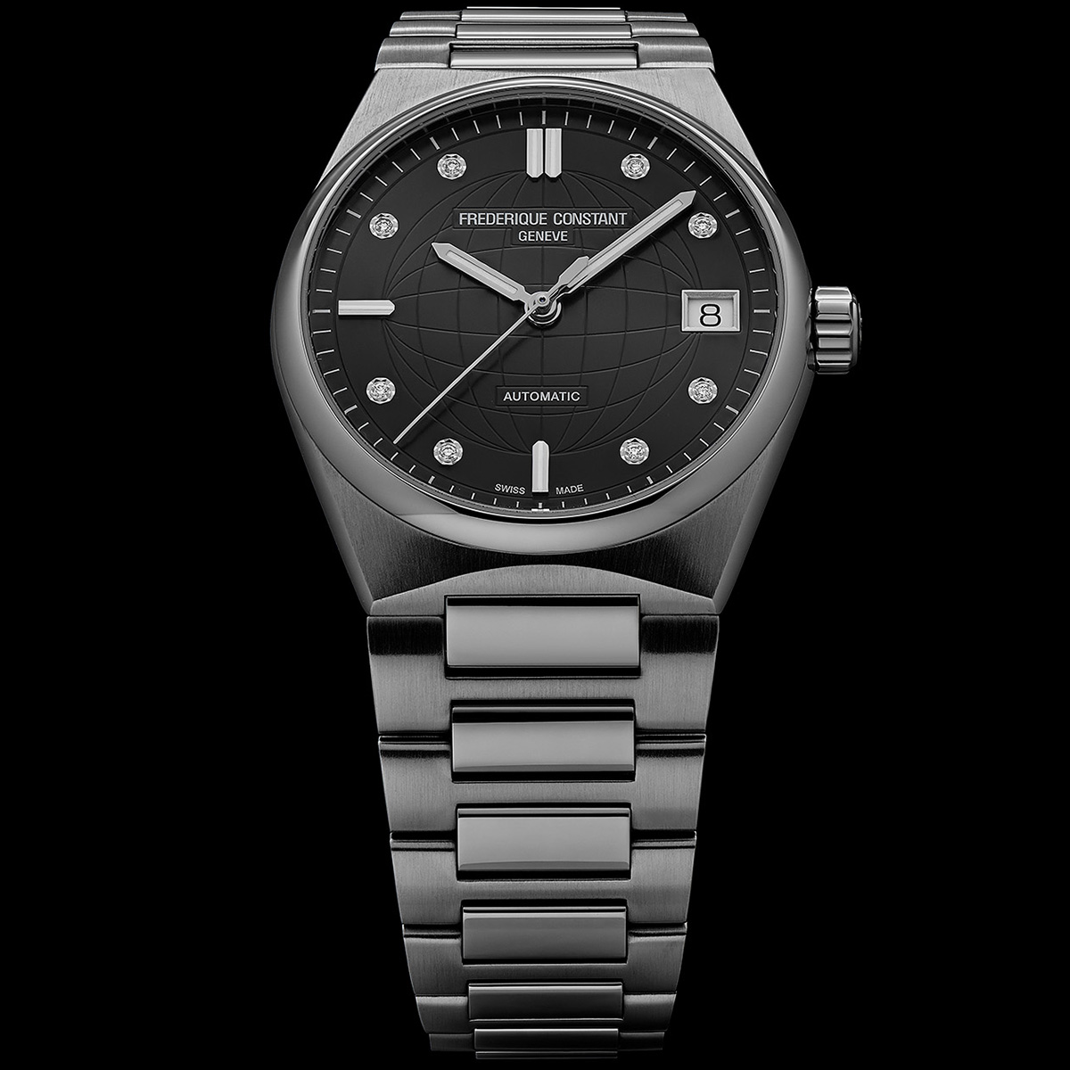 Frederique Constant Highlife Ladies Automatic FC-303BD2NH6B to damski model z, który w oryginalny i widoczny sposób podkreśli każdą stylizację kobiety lubiącą elegancję, wygodę, praktyczność i wysokiej klasy dodatki w stylu fashion. Pierwszym elementem szwajcarskiego zegarka, który przyciąga uwagę, jest czarna tarcza. Wykonana z wysokiej jakości materiałów, gwarantuje trwałość, a utrzymana w minimalistycznym stylu, nadaje zegarkowi elegancji. Na tarczy umieszczone są stylizowane indeksy w formie diamentów oraz finezyjne wskazówki, które podkreślają oryginalność tego modelu. Dodatkowo tarcza wyposażona jest w datownik dnia miesiąca na godzinie 3, który ułatwia sprawdzanie daty.