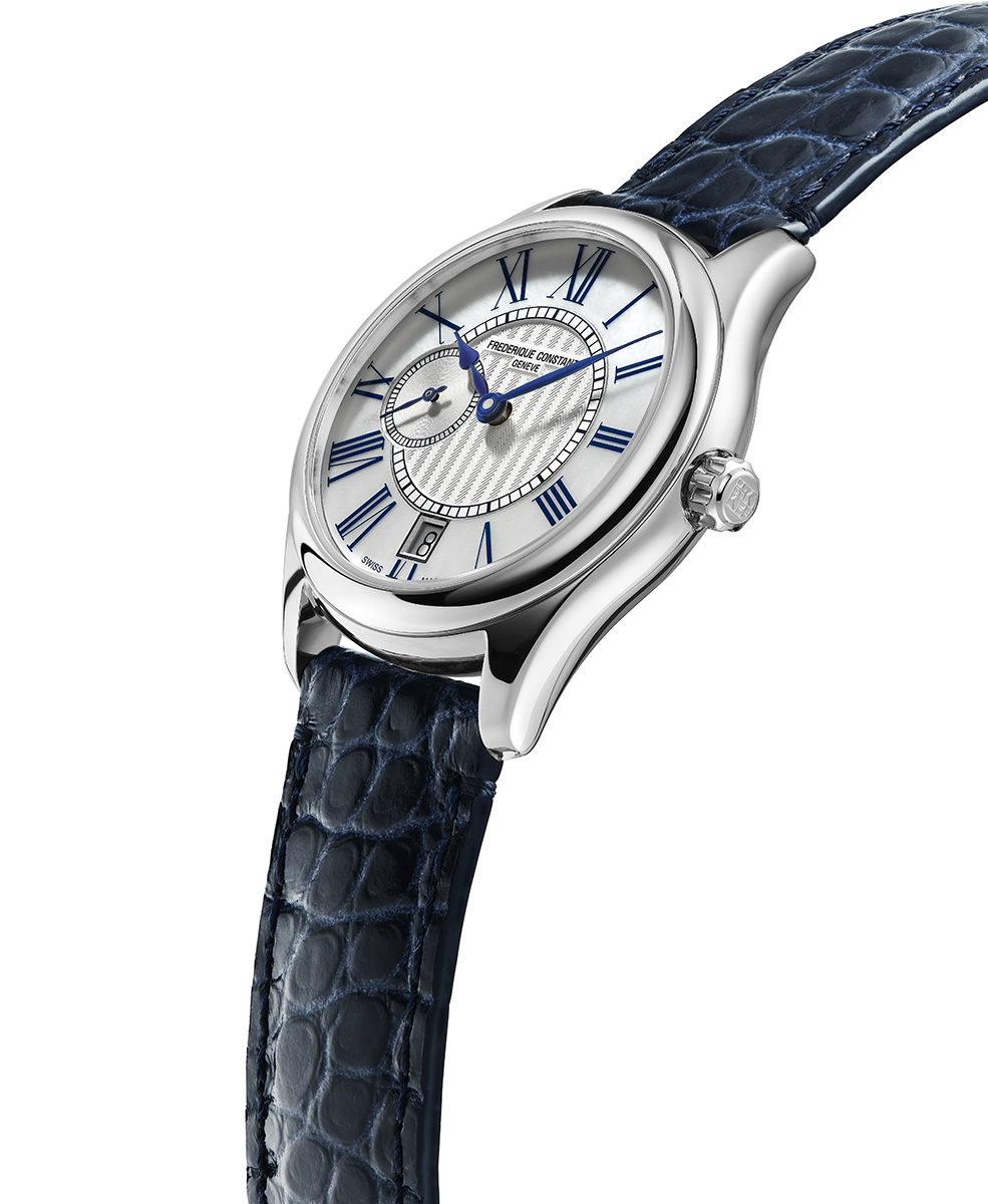 Szwajcarski damski zegarek Frederique Constant Ladies Automatic Small Seconds to przykład doskonałego rzemiosła i estetyki. Tarcza wykonana jest z wysokiej jakości materiałów, co gwarantuje wyjątkową trwałość. Utrzymana w delikatnych odcieniach srebra, nadaje zegarkowi oryginalności. Na tarczy umieszczone są niebieskie indeksy w formie rzymskich cyfr oraz finezyjne wskazówki, podkreślające klasę czasomierza. Oryginalny akcent stanowi małe sekundowe okienko umieszczone na godzinie 9, które nadaje zegarkowi unikalnego charakteru. Dodatkowo tarcza wyposażona jest w datownik dnia miesiąca na godzinie 6, który ułatwia sprawdzanie daty.