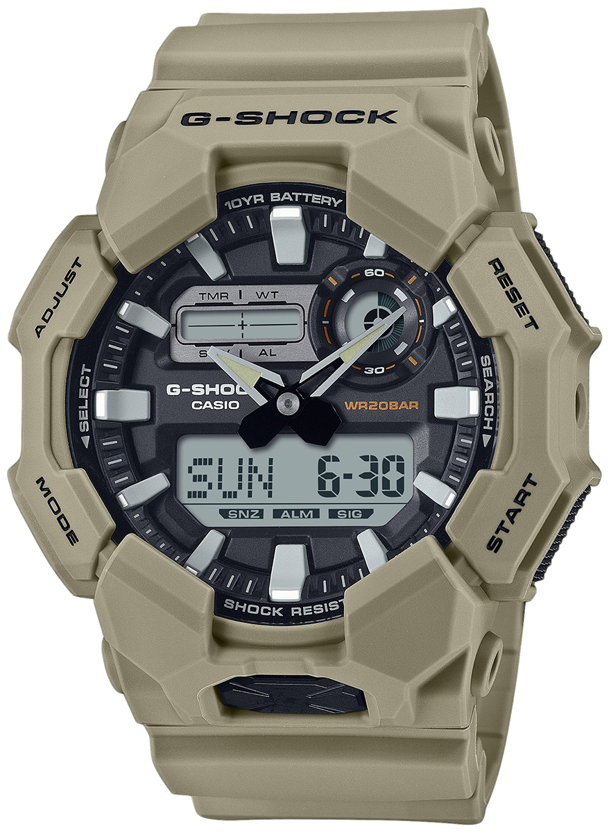 GA-010-5AER oparty jest na precyzyjnym mechanizmie kwarcowym, gwarantującym punktualność i długą żywotność baterii. Wbudowane funkcje, takie jak stoper, timer, alarm, a także podświetlenie, co sprawia, że zegarek świetnie sprawdzi się zarówno w codziennym użytkowaniu, jak i podczas podróży czy treningów.