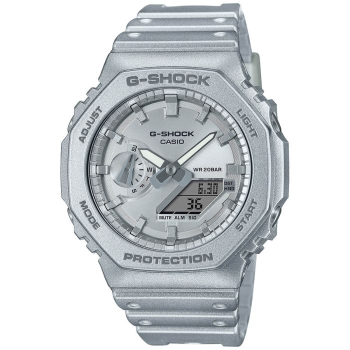 Zegarek GA-2100FF-8AER posiada stalowo-srebrną tarczę, która przyciąga uwagę i dodaje mu energii. Odczyt czasu odbywa się zarówno w sposób analogowy, jak i cyfrowy, co zapewnia wygodę i precyzyjność. Podświetlenie LED (dioda elektroluminescencyjna) umieszczone na tarczy zapewnia czytelność w ciemności, gwarantując idealne odczytanie czasu o każdej porze dnia.
