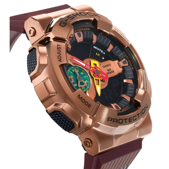 Model GM-110RH-1AER to twardziel, tak jak reszta rodziny G-Shock. Wspomniana już stalowa obudowa oraz system wstrząsoodporny tworzą duet, który zapewnia bezpieczeństwo wnętrza zegarka, nawet w ekstremalnych sytuacjach. Mocne szkło mineralne, element odporny na zarysowania, chroni tarczę i wskazówki. Wodoszczelność klasy WR 200 uniemożliwia wodzie wdarcie się do środka zegarka nawet przy ciśnieniach rzędu 20 barów. Słynna wytrzymałość zegarków G-Shock to nie slogan — to fakt. O tak skonstruowany zegarek nie trzeba się martwić, a zamiast tego można cieszyć się jego funkcjonalnością i dizajnem.