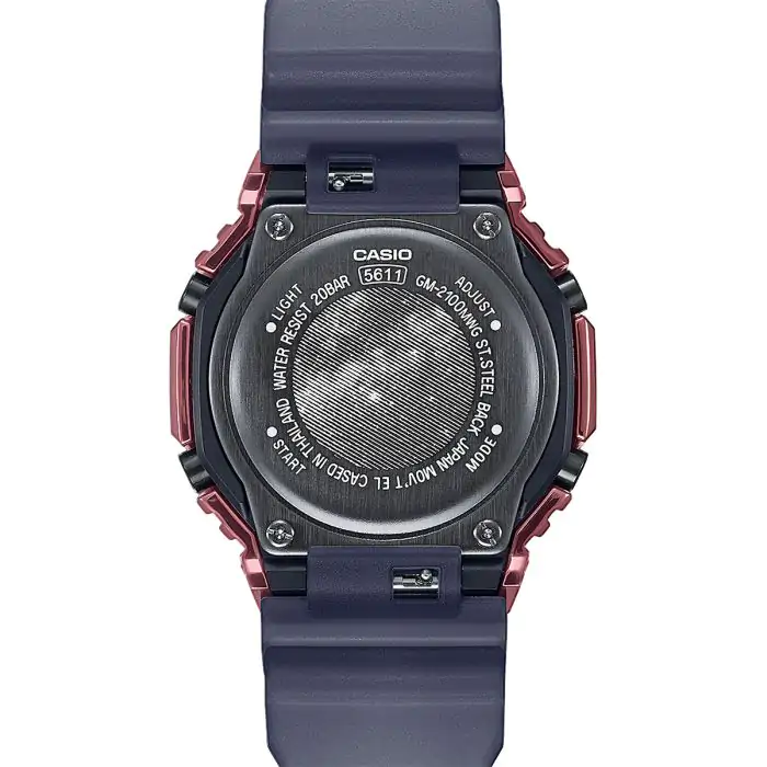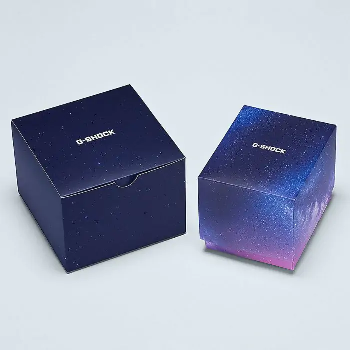 Koperta zegarka posiada gradientowy nadruk oraz pokryta jest fioletową powłoką IP. Ponadto powłoka została poddana dodatkowej obróbce laserowej, dzięki temu posiada kosmiczny wygląd. Takie rozwiązania sprawiają, że koperta tego męskiego zegarka G-Shock jest spektakularna i trwała.