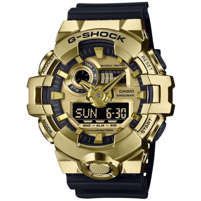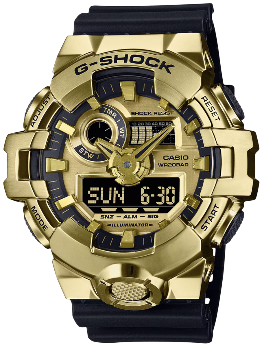 Model GM-700G-9AER posiada tarczę w kolorze złotym, na której umieszczono analogowo-cyfrowy wyświetlacz. Duże, dobrze widoczne wskazówki oraz segment cyfrowy gwarantują łatwy dostęp do wszystkich funkcji zegarka. Zastosowane podświetlenie umożliwia wygodne korzystanie z czasomierza w ciemności, a szkło mineralne zabezpiecza tarczę przed zarysowaniami.