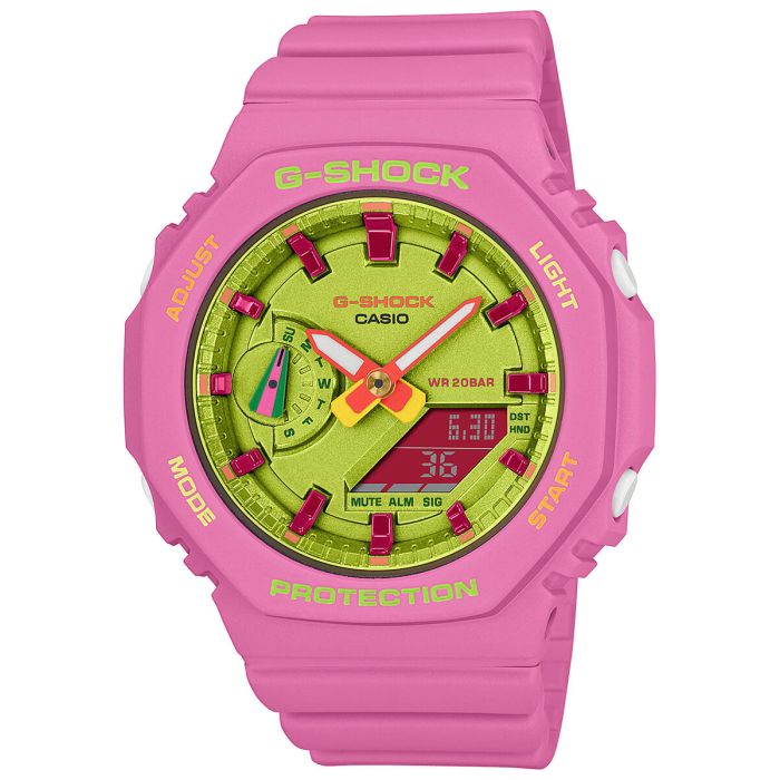 Zielona tarcza GMA-S2100BS-4AER łączy w sobie nowoczesny wygląd analogowego zegarka z funkcjonalnością cyfrowego wyświetlacza. Powłoka Neobrite na niektórych elementach tarczy zapewnia doskonałą czytelność odczytu godzin, nawet w ciemności. Dodatkowo, zegarek jest wyposażony w technologię Dual Illuminator, która równomiernie oświetla tarczę za pomocą dwóch źródeł światła. To idealne rozwiązanie dla aktywnych kobiet, które cenią sobie czytelność w każdej sytuacji. GMA-S2100BS-4AER oferuje wiele przydatnych funkcji dla aktywnych kobiet. Możliwość wyboru między czasem 12-godzinnym a 24-godzinnym zapewnia elastyczność w odczycie czasu. Czas światowy ułatwia poruszanie się między strefami czasowymi, a funkcja mute pozwala wyłączyć dźwięki zegarka za pomocą jednego przycisku. Dodatkowo, zegarek posiada pięć alarmów dziennych, rozbudowany kalendarz, precyzyjny stoper z dokładnością do setnej sekundy oraz timer o maksymalnej długości pomiaru 24 godzin. Odporność na wstrząsy, charakterystyczna dla serii G-SHOCK, sprawia, że zegarek jest gotowy na każde wyzwanie.