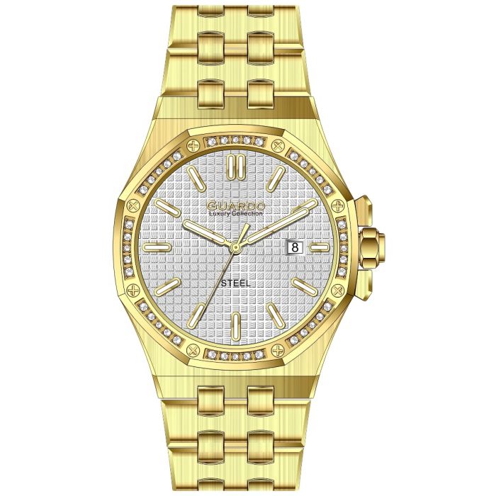 GUARDO S03009-3 ma srebrną tarczę, która harmonizuje ze złotą kopertą. Tarcza jest ozdobiona białymi wskazówkami i indeksami, które zapewniają czytelność i kontrast. Zegarek posiada funkcję datownika. Szkło zegarka jest mineralne, odporne na zarysowania i uderzenia.