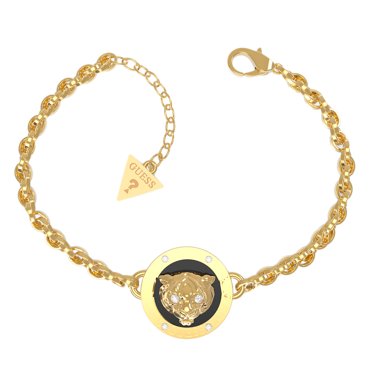 Bransoletka GUESS Daktari JUBB01363JWYGBKS to elegancki dodatek, idealny dla pań ceniących wyraziste akcenty. Wykonana ze stali szlachetnej w złotym kolorze, posiada klasyczny splot typu ankier. Centralnym elementem jest zawieszka ozdobiona płaskorzeźbą tygrysa, dodatkowo udekorowana cyrkoniami o brylantowym szlifie, które dodają całości blasku. Bransoletka posiada zapięcie na karabińczyk, zapewniając bezpieczeństwo i wygodę użytkowania. Maksymalny obwód wynosi 22 cm. Jest to biżuteria typu celebrytka, doskonała na różne okazje. Produkt objęty jest 2-letnią gwarancją.