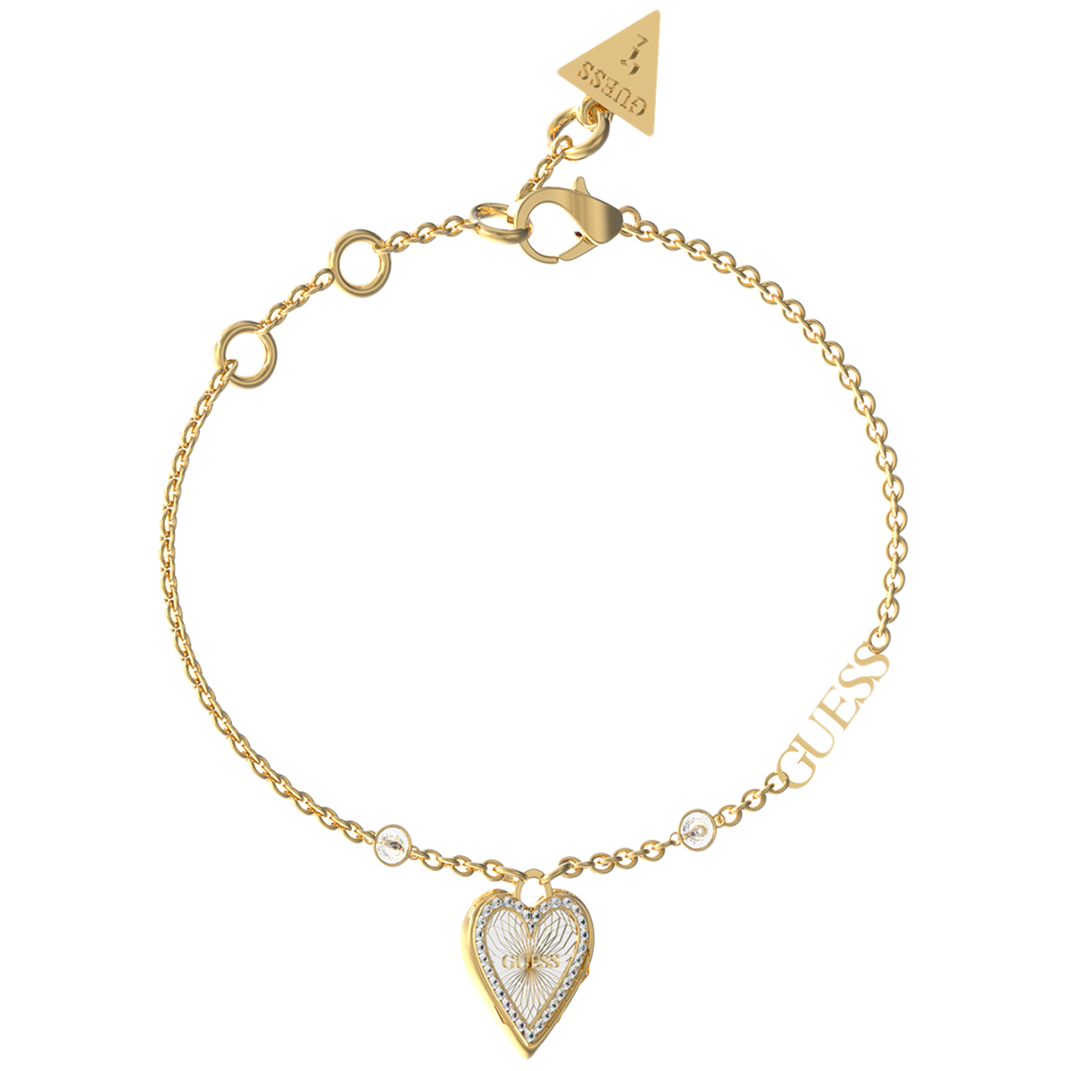 Bransoleta Guess Love Me Tender JUBB03242JWYGRHS to stylowy i elegancki dodatek, który przyciąga wzrok. Wykonana z wysokiej jakości stali 316L, wyróżnia się trwałością i odpornością na korozję. Złoty kolor i subtelna powłoka PVD nadają jej wyjątkowy blask, a motywy rozgwiazdy i serca w połączeniu z cyrkonią tworzą romantyczny i nowoczesny wygląd.