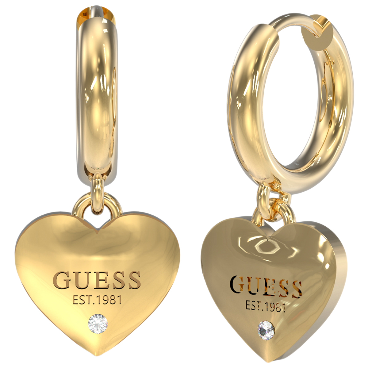 Kolczyki GUESS Huggie Me JUBE03145JWYGT/U to eleganckie i romantyczne dodatki, które świetnie uzupełnią każdą stylizację. Wykonane z platerowanej stali nierdzewnej w kolorze złotym, zapewniają trwałość oraz odporność na działanie czynników zewnętrznych. Kolczyki mają okrągły kształt i zawieszkę w kształcie serca, ozdobioną błyszczącą sześcienną cyrkonią. W centralnej części serca wygrawerowane jest logo GUESS. Zapięcie na haczyk gwarantuje wygodę zakładania i zdejmowania. Kolczyki mają długość 2,6 cm i są zapakowane w oryginalne pudełko GUESS, co czyni je idealnym prezentem.