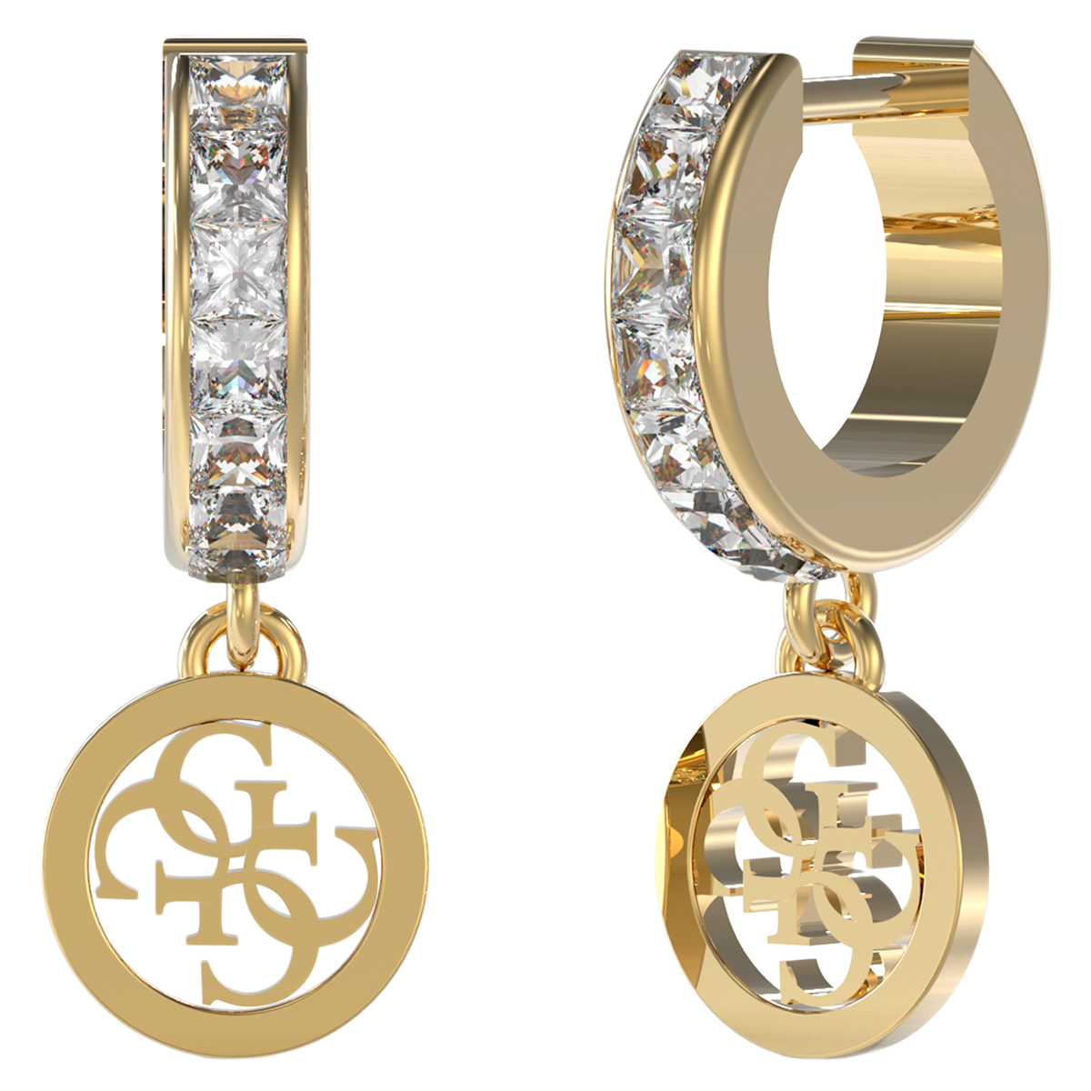Kolczyki GUESS Huggie Me JUBE03147JWYGT/U to elegancki dodatek, który doskonale uzupełni każdą stylizację. Wykonane ze stali szlachetnej w kolorze złota, przyciągają uwagę dzięki okrągłej zawieszce z logotypem marki GUESS oraz połyskującym kryształkom, które dodają im blasku. Kolczyki są wygodne w noszeniu, mają wysokość 20 mm i szerokość 10 mm. Dzięki starannemu wykonaniu i trwałym materiałom, będą cieszyć oko przez długi czas. Produkt objęty jest 2-letnią gwarancją producenta.