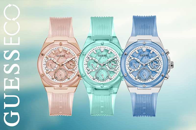 Koperty zegarków z serii ECO Guess powstają ze stali szlachetnej oraz przezroczystego nylonu wykonanego w 45% z tworzywa roślinnego, ich tarcze pokrywa odporne na zarysowania szkło mineralne. Nylonowe paski, w bogatej pastelowej kolorystyce, są stworzone w 49% z biologicznych polimerów z ziaren rącznika pospolitego, a w przypadku niektórych modeli dodatkowo wzmocnione etycznie pozyskiwaną, neutralną dla środowiska skórą. Sprzączki oraz koronki do tych zegarków również produkuje się w 45% z materiałów pochodzenia naturalnego.