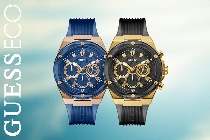 Koperty zegarków z serii ECO Guess powstają ze stali szlachetnej oraz przezroczystego nylonu wykonanego w 45% z tworzywa roślinnego, ich tarcze pokrywa odporne na zarysowania szkło mineralne. Nylonowe paski, w bogatej pastelowej kolorystyce, są stworzone w 49% z biologicznych polimerów z ziaren rącznika pospolitego, a w przypadku niektórych modeli dodatkowo wzmocnione etycznie pozyskiwaną, neutralną dla środowiska skórą. Sprzączki oraz koronki do tych zegarków również produkuje się w 45% z materiałów pochodzenia naturalnego.