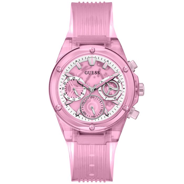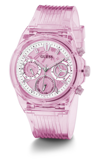 Guess GW0438L2 posiada ograniczoną wodoszczelność, dlatego zaleca się unikanie kontaktu z wodą, chociaż przypadkowy kontakt z niewielką ilością wilgoci nie powinien stanowić problemu. Różowa koperta wykonana z lekkiego i wytrzymałego tworzywa sztucznego nadaje zegarkowi uroku i zapewnia wygodę noszenia, nawet w ciepłe dni.