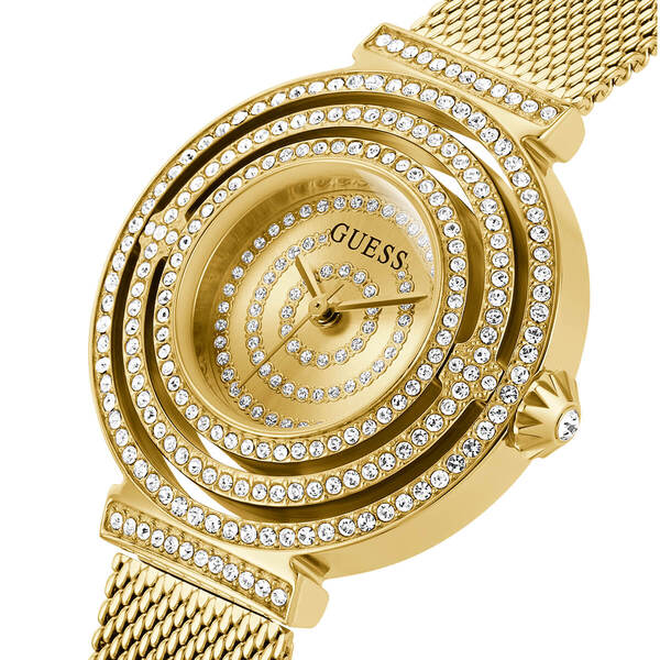 Otoczona z każdej strony zdobieniami, niewielka koperta w kolorze złotym mieści w sobie absolutnie minimalistycznie przedstawiony cyferblat, na który składają się smukłe, złote wskazówki, oraz zapisana czarną czcionką nazwa marki Guess.