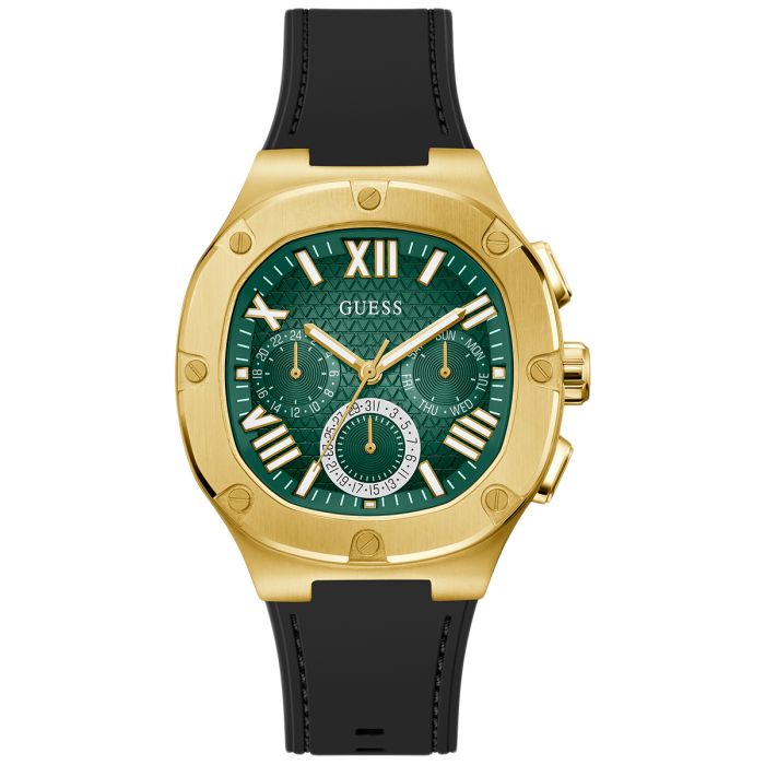 Tarcza zegarka GUESS GW0571G3 wyróżnia się eleganckim zielonym kolorem, który nadaje mu wyrafinowanego wyglądu. Jej powierzchnię pokrywa giloszowany, trójkątny wzór.
