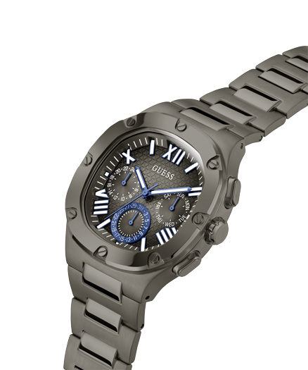 Tarcza o eleganckim szarym kolorze jest zdobiona giloszowaniem, co nadaje zegarkowi Guess GW0572G5 unikalnego wyglądu. Dodatkowy akcent wprowadzają niebieskie elementy oraz sub-tarcze czasu dobowego, datownika dni miesiąca i dni tygodnia. Szkiełko mineralne chroni tarczę przed zarysowaniami, utrzymując ją w doskonałym stanie.
