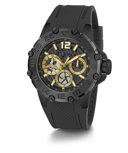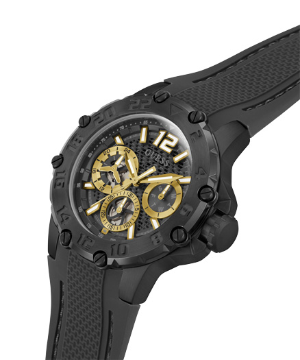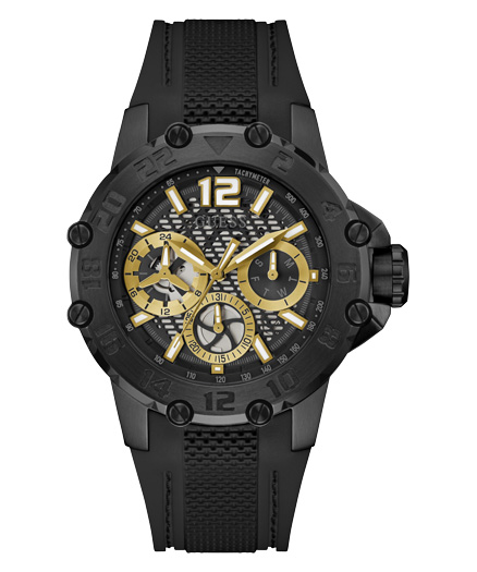 Zegarek męski GUESS GW0640G2 posiada czarną, siatkowaną tarczę. Struktura ta dodaje temu czarnemu zegarkowi surowości godnej prawdziwego twardziela. W połączeniu ze złotymi subtarczami, indeksami oraz wskazówkami tarcza wygląda designersko oraz luksusowo. Ponadto, wskazówki oraz indeksy pokryte są powłoką luminescencyjną, co ułatwia odczytanie godzinę również w nocy za sprawą tego czarnego męskiego zegarka Guess.