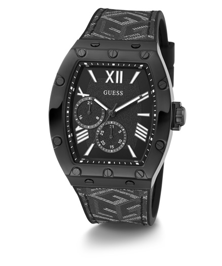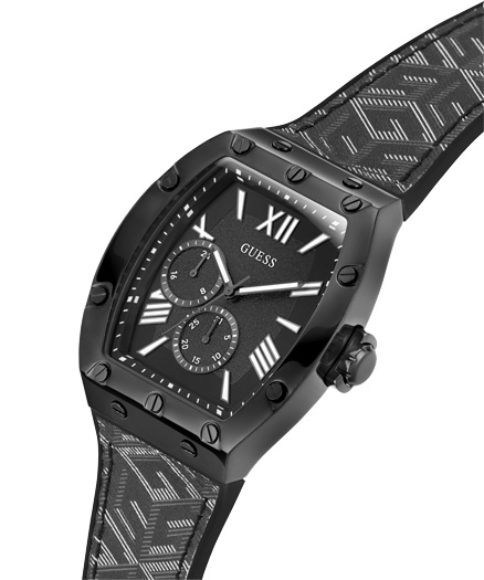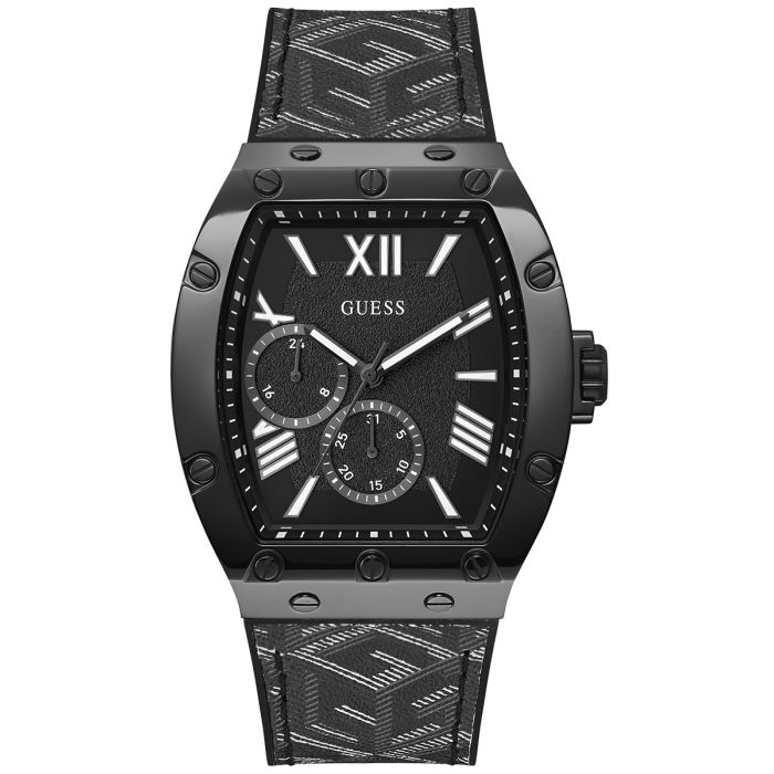 Na czarnej tarczy zegarka GUESS GW0645G2 odczyt czasu odbywa się za pomocą wskazówek oraz indeksów pod postacią liczb rzymskich. Czarny kolor tarczy tworzy kontrast z elementami wskazówek, zapewniając czytelność pomiaru czasu. Szkło mineralne chroni tarczę przed zarysowaniami, utrzymując ją w idealnym stanie.