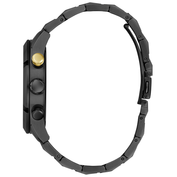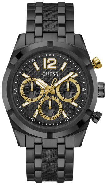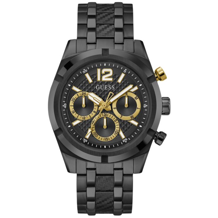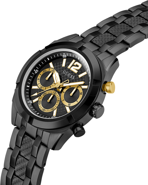 Czarna tarcza zegarka GUESS GW0714G4 jest nie tylko estetyczna, ale także funkcjonalna. Złote subtarcze i indeksy godzinowe dodają mu dynamicznego wyglądu, podkreślając jednocześnie jego wyjątkowy charakter. Precyzyjny mechanizm chronograficzny oraz dodatkowy przycisk w kolorze złota zapewniają nie tylko dokładność pomiaru czasu, ale także dodatkowe funkcje, czyniąc zegarek jeszcze bardziej praktycznym.