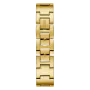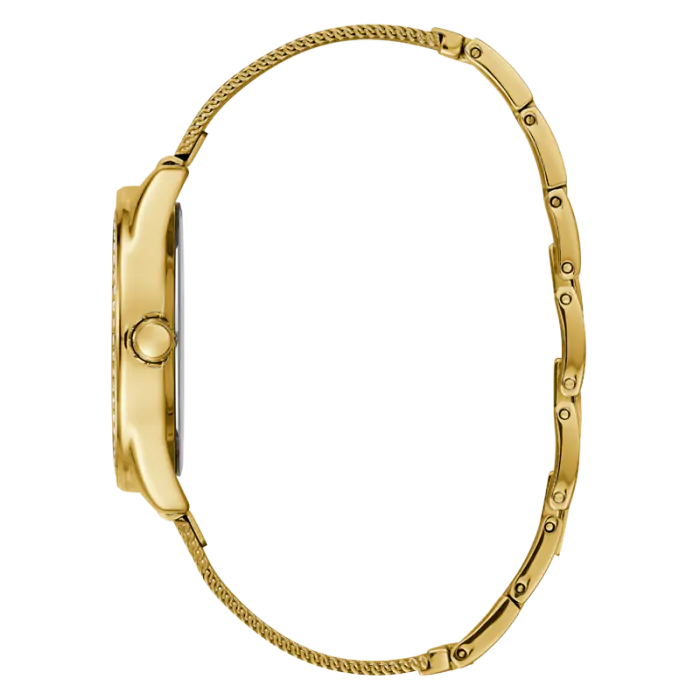 Zegarek Guess Tri Glitz W1142L2 to modny czasomierz w stylu fashion skierowany do kobiet ceniących sobie indywidualny styl. Stalowa koperta o średnicy 36,5 mm została zawieszona na wygodnej i ciekawej bransolecie typu mesh. Całość została wykończona powłoką IP w kolorze złota. Wewnątrz zamontowany został dokładny kwarcowy mechanizm. Tarcza została wykończona w minimalistyczny sposób prezentujący charakterystyczne trójkątne logo tego producenta. Zabezpiecza ją bardzo wytrzymałe szkło mineralne. Całość stanowi bardzo ciekawe połączenie, które przyciąga wzrok i daje poczucie wyszukanego stylu. Klasa wodoszczelności 10M pozwala niewielki kontakt z woda np. drobne zachlapania.
