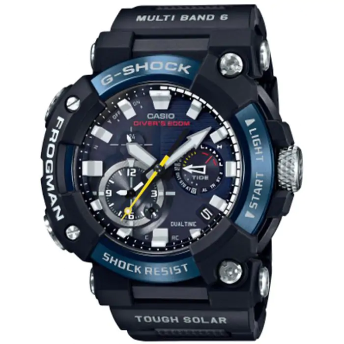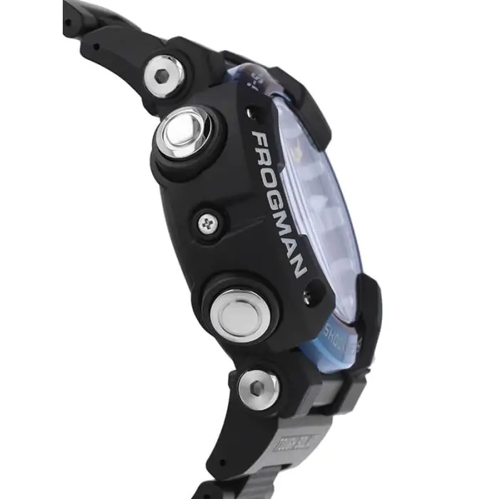 Zegarek ma wiele typowych dla czasomierzy G-SHOCK funkcji– alarm, stoper, 24 h timer, strefy czasowe. Dokładny czas gwarantuje odbiór sygnału zegarów atomowych z satelitów krążących wokół Ziemi. Frogman GWF-A1000 jest wyjątkowy w każdym calu – nie da się go nie rozpoznać - ma asymetryczną obudowę, jego mechanizm chroni unikatowa koperta typu monocoque (stanowiąca jedną całość, bez dekla) wykonana z włókien węglowych co sprawia, że jest wyjątkowo lekka oraz wytrzymała. Z tyłu obudowy znajduje się charakterystyczny rysunek, symbol FROGMANA, gwarancja wodoszczelności 200 m WR200m zgodnie ze standardami ISO dla zegarków nurkowych .