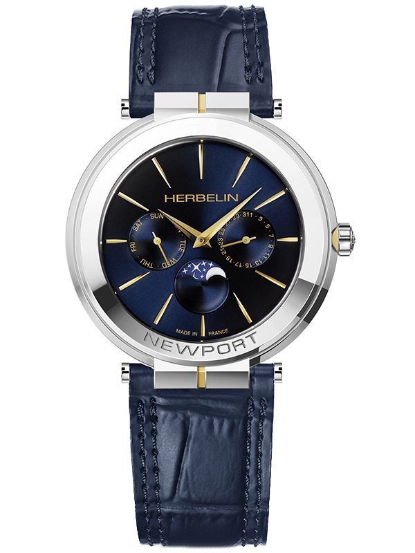 Tarcza tego zegarka męskiego Herbelin ma granatowy kolor. Na jej tle wyróżniają się srebrne indeksy w formie cienkich kresek. Całość uzupełniają stylizowane złote wskazówki. Na godzinie trzeciej umieszczono datownik informujący o aktualnym dniu miesiąca, a na godzinie dziewiątej – ten wskazujący na dzień tygodnia. Z kolei na godzinie szóstej umieszczono wskaźnik faz księżyca. Do ochrony tarczy wykorzystano znane z ogromnej odporności na zarysowania szkło szafirowe.