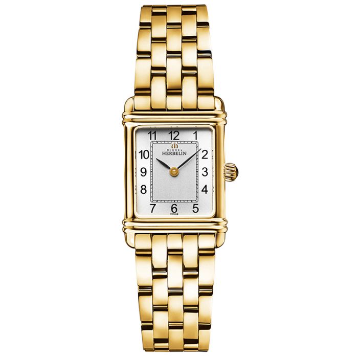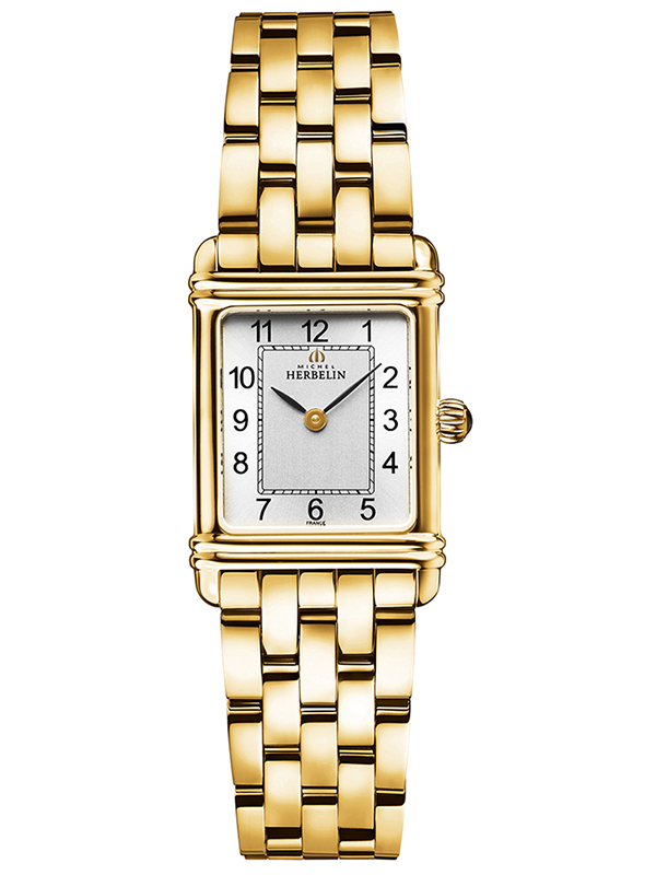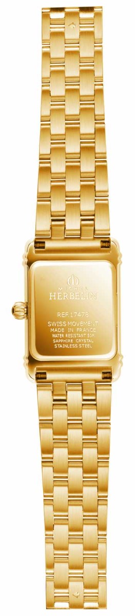 Zegarek damski z kwadratową tarczą Herbelin posiada wykonane ze stali szlachetnej kopertę oraz bransoletę. Ten rodzaj materiału charakteryzuje się odpornością na uszkodzenia mechaniczne oraz działanie korozji. Jego kolejną zaletą jest hipoalergiczność, dzięki czemustal jest bezpieczna dla osób o wrażliwej. Obydwa elementy mają barwę złota, dziki czemu idealnie komponują się ze srebrną tarczą czasomierza.
