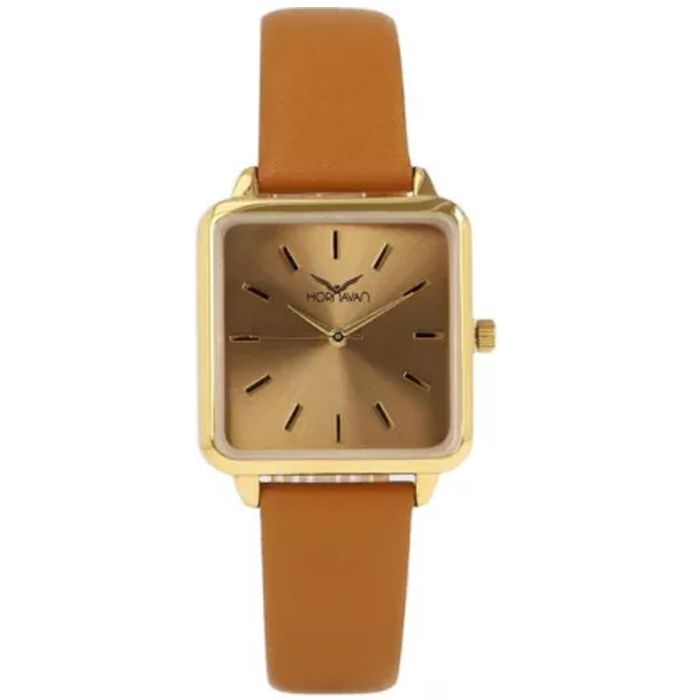 Hornavan HO30741070110 to przedstawiciel kolekcji Host, która jest skierowana do szykownych kobiet. Charakteryzuje ją kwadratowa koperta i modny, wygodny pasek skórzany. Koperta tego modelu została wykonana z odpornej na warunki atmosferyczne stali szlachetnej, którą pokryto powłoką IP w kolorze złota. W połączeniu z paskiem w brązowym kolorze tworzy spójną całość. Na minimalistycznej tarczy umieszczono wskazówki wyróżniające się na tle brązowego cyferblatu. Tarczę wraz z japońskim mechanizmem zabezpieczono szkłem mineralnym, które posiada zwiększoną odporność na stłuczenia. Wodoszczelność tego modelu określono jako 30M co znaczy, że nie zaszkodzą mu zachlapania powstałe na przykład podczas mycia rąk.