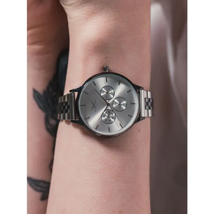 Hornavan KU31056080220 to przedstawiciel kolekcji Kust, która jest skierowana do kobiet. Koperta tego modelu została wykonana z odpornej na warunki atmosferyczne stali szlachetnej, którą pokryto powłoką IP w szarym kolorze. Kopertę połączono z modną i wygodną stalową bransoletą. Na minimalistycznej tarczy o ciekawym wykonaniu umieszczono wyraźne wskazówki i indeksy, które pozwalają na wygodny i szybki odczyt godziny. Tarczę wraz z japońskim mechanizmem zabezpieczono szkłem mineralnym, które posiada zwiększoną odporność na stłuczenia. Mechanizm zegarka został wyposażony dodatkowo w datownik dni miesiąca i tygodnia oraz wskazanie czasu w systemie 24-godzinnym. Wodoszczelność tego modelu określono jako 30M co znaczy, że nie zaszkodzą mu zachlapania powstałe na przykład podczas mycia rąk.