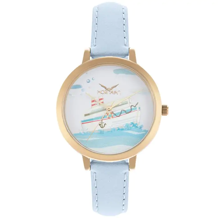 Hornavan ME30424090110 to przedstawiciel kolekcji Minne, która jest skierowana do pewnych siebie kobiet. Koperta tego modelu została wykonana z odpornej na warunki atmosferyczne stali szlachetnej, którą pokryto powłoką IP w kolorze złota. W połączeniu z modnym i wygodnym skórzanym paskiem koloru niebieskiego, tworzy spójną kompozycję. Na tarczy, której motywem przewodnim jest płynący statek umieszczono wyraźne wskazówki, które pozwalają na wygodny i szybki odczyt godziny. Tarczę wraz z japońskim mechanizmem zabezpieczono szkłem mineralnym, które posiada zwiększoną odporność na stłuczenia. Wodoszczelność tego modelu określono jako 30M co znaczy, że nie zaszkodzą mu zachlapania powstałe na przykład podczas mycia rąk.