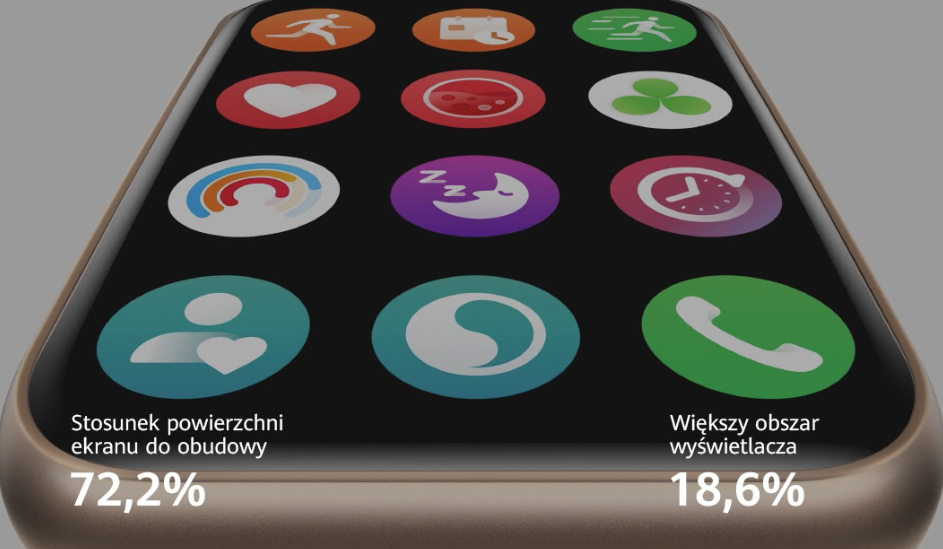 Za sprawą kwadratowego, 1,74-calowego wyświetlacza AMOLED HD FullView możesz cieszyć się żywymi, nasyconymi barwami. W nowej generacji smartwatcha Huawei Watch Fit masz do dyspozycji obszar wyświetlania większy o 18,6% w stosunku do Huawei Watch Fit New. Stosunek wyświetlacza do obudowy wynosi aż 72,2%, natomiast jego rozdzielczość to 336 PPI i 336 × 480. Dzięki tak imponującym parametrom smartwatch ma niezwykle czytelny wyświetlacz, który przykryty jest trwałym szkłem Gorilla Glass.