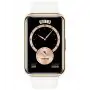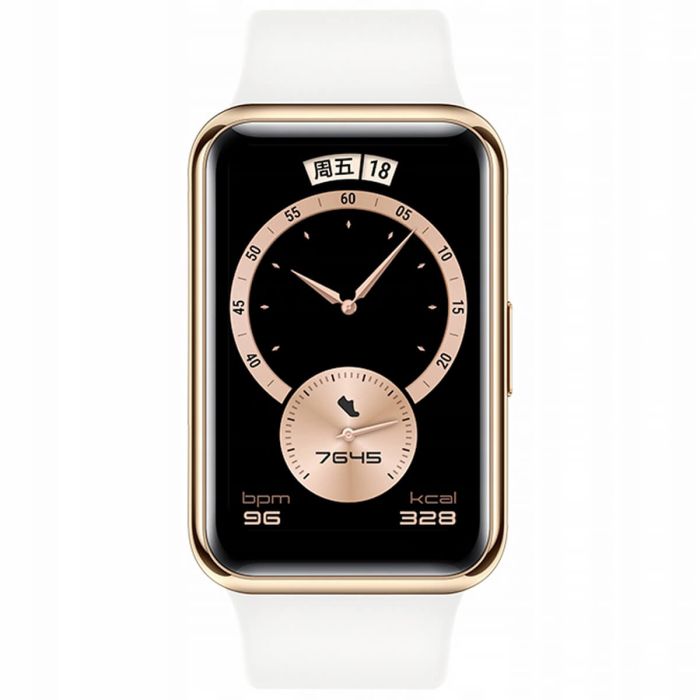 Złota koperta Huawei Watch Fit New waży zaledwie 34 g. Fluoroelastomer -materiał, z którego wykonany jest biały pasek, jest elastyczny oraz nie podrażnia skóry. Sprawdzi się zatem świetnie w codziennym użytkowaniu, lecz również podczas ćwiczeń bądź snu. Polimerowa koperta o matowym wykończeniu idealnie komponuje się z kolorowymi paskami. Design tego urządzenia sprawia, że ten funkcjonalny smartwatch jest również gustownym dodatkiem.