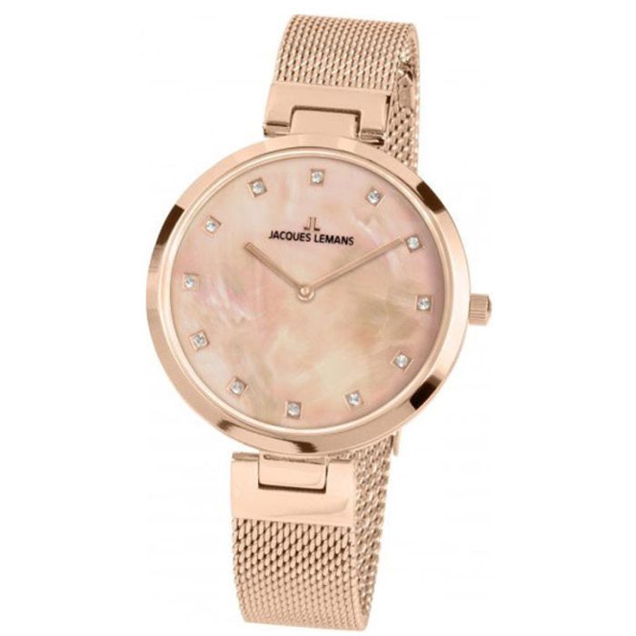 Elegancki zegarek damski Jacques Lemans Milano JL 1-2001H to model, który doskonale sprawdzi się zarówno z elegancką kreacją jak i codziennym stroju. Koperta została wykonana z wysokiej jakości stali szlachetnej, która jest odporna na działanie warunków atmosferycznych. Elegancka bransoleta doskonale dopełnia całość. Całość pokryto powłoką w kolorze różowego złota. Cyferblat z masy perłowej został przykryty utwardzonym szkłem mineralnym. Zegarek posiada wodoszczelność 50M co chroni zegarek przed zachlapaniem.