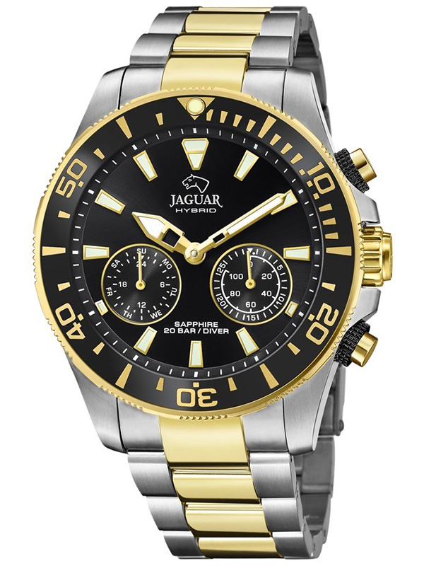Zegarek męski hybrydowy Jaguar Connected Hybrid Smartwatch J889/2 to multifunkcjonalne akcesorium, które stanie się zarówno osobistym asystentem, jak i trenerem personalnym, przystosowanym również do uprawiania sportów wodnych. Czarna tarcza doskonale kontrastuje z biało-złotymi indeksami oraz wskazówkami pokrytymi powłoką luminescencyjną, pozwalając na śledzenie czasu nawet w ekstremalnych warunkach. Urządzenie wyposażone jest w dwa subdyski, które nadają wielofunkcyjności temu modelowi. Dodatkowo na zegarku widnieje logo Jaguar, które podkreśla szwajcarski kunszt zegarmistrzowski.