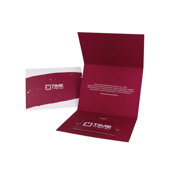 Jeśli nie masz pomysłu na upominek dla bliskiej Ci osoby lub boisz się, że nie trafisz w jej gust sięgnij po kartę podarunkową Time Trend. Z naszą kartą masz pewność, że obdarowany ucieszy się z upominku, a nasi profesjonalni Doradcy Klienta z pewnością pomogą w wyborze idealnego zegarka. Każda z kart pakowana jest w ozdobne pudełko, na którym możesz umieścić podpis i dedykację.