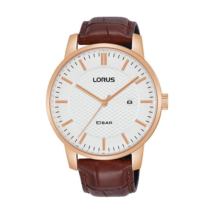 Lorus RH978NX9 to męski zegarek o klasycznym charakterze, w którym zamontowano mechanizm kwarcowy wyposażony w datownik, który wskazuje aktualny dzień miesiąca. Koperta tego modelu o średnicy 42 mm wykonana jest ze stali nierdzewnej, która charakteryzuje się wysoką odpornością na warunki atmosferyczne. Osadzono w niej trwałe szkło mineralne. W połączeniu z gustownym skórzanym paskiem tworzy spójną całość. Tarcza koloru białego idealnie kontrastuje z oznaczeniami godzin, co sprawia, że jest przejrzysta i czytelna. Wodoszczelność 100M pozwala na kontakt z wodą, np. pływanie powierzchniowe.