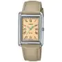 Beżowa tarcza zegarka harmonizuje z kolorem paska i koperty. Na tarczy znajdują się czarne, rzymskie indeksy oraz srebrne wskazówki. Wskazówka sekundowa wyróżnia się za sprawą zielonego koloru. Tarcza jest chroniona przez szkło akrylowe.