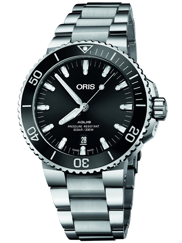 Zegarek Oris Aquis Date wyróżnia się czarną tarczą, która doskonale komponuje się z srebrną kopertą. Szafirowe szkło z antyrefleksem o twardości 9 w skali Mohsa zapewnia doskonałą ochronę przed zarysowaniami i pozwala na czytanie godziny bez żadnych refleksów świetlnych. Dodatkowo, zegarek posiada funkcje takie jak zakręcana koronka na gwint, obrotowa luneta (bezel), fluorescencyjne indeksy i wskazówki oraz możliwość nakręcania koronką.