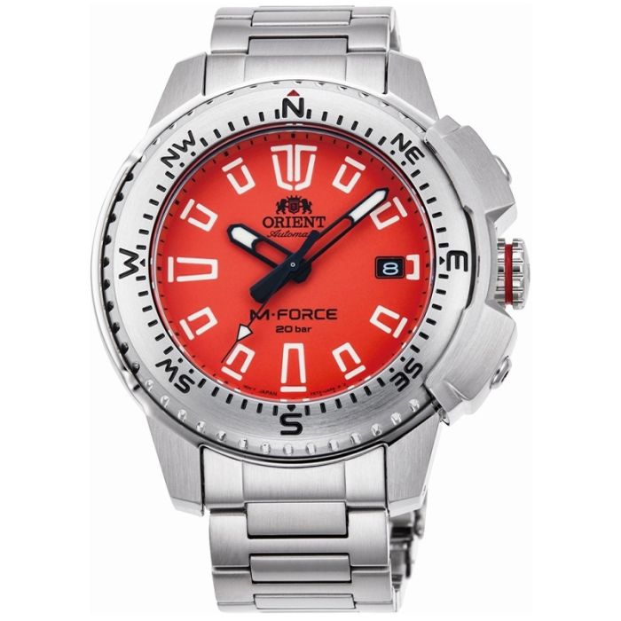 Zegarek męski z czerwoną tarczą posiada srebrną kopertę, która została przymocowana do solidnej bransolety w tym samym kolorze. Obydwa te elementy zostały wykonane ze stali szlachetnej 316 L. Materiał ten odznacza się niezwykłą odporności na działanie korozji oraz uszkodzenia mechaniczne. Koperta posiada także zakręcany dekiel, który zapewnia wyższą szczelność urządzenia. Bransoleta ma zapięcie motylkowe z zabezpieczeniem, które zapobiega jej przypadkowemu rozpięciu. Poziom wodoszczelności tego sportowego zegarka męskiego Orient wynosi 200 m. Oznacza to, że podczas pywania lub nurkowania z akwalungiem do jego wnętrza nie dostanie się ani kropla wody.