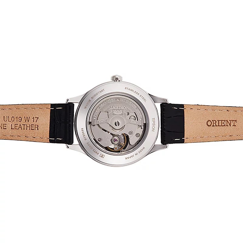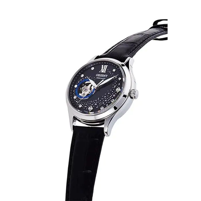 Zegarek damski z widocznym mechanizmem Orient posiada srebrną kopertę, która została wykonana ze stali szlachetnej 316 L. Materiał ten odznacza się dużą odpornością na działanie korozji oraz uszkodzenia mechaniczne co gwarantuje ukrytemu w jej wnętrzu mechanizmowi doskonałą ochronę. Koperta ma także przeszklony dekiel, pozwalający zajrzeć do jej wnętrza. Z kolei czarny, zapinany na sprzączkę, pasek został wykonany ze skóry naturalnej. Wytrzymałość i odporność na pęknięcia nie są jej jedynymi zaletami. Skóra dopasowuje się także do kształtu nadgarstka, co zwiększa komfort noszenia. Klasa wodoszczelności dla tego damskiego zegarka została oszacowana na 30 m. Oznacza to, że jest od odporny na zachlapania oraz podwyższony poziom wilgoci, np. w trakcie mycia rąk.