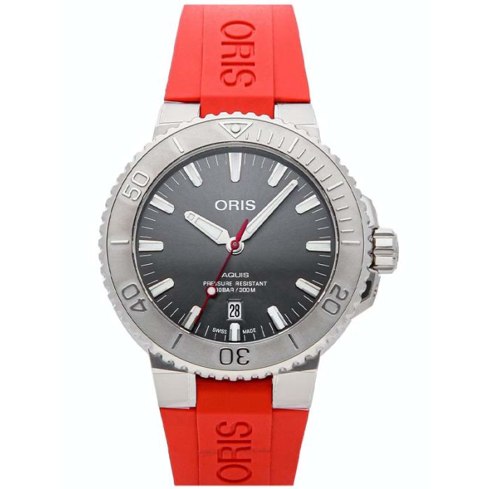 Oris Aquis 0173377304153-0742466EB to męski model, który w oryginalny i widoczny sposób podkreśli każdą stylizację użytkownika lubiącego elegancję, wygodę, praktyczność i wysokiej klasy dodatki w stylu sportowym. Tarcza szwajcarskiego męskiego zegarka jest niezwykle imponująca. To doskonałe połączenie funkcjonalności, estetyki i wytrzymałości. Cyferblat jest niezwykle czytelna z głębokim odcieniem szarości oraz precyzyjnymi, białymi indeksami, które ułatwiają odczytywanie czasu. Dodatkowo zegarek wyposażony jest w datownik dnia miesiąca na godzinie 6, który ułatwia sprawdzanie daty.