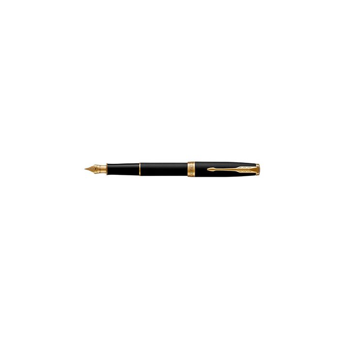 Parker Sonnet to kwintesencja kunsztu marki Parker, to symbol ponadczasowej elegancji. Powierzchnia: Korona i potrójny pierścień pióra mosiężna platerowana złotem. Korpus i nasadkę wykonano z mosiądzu i pokryto matowym, satynowym, czarnym lakierem. Klip z stali nierdzewnej platerowany złotem.