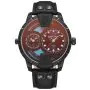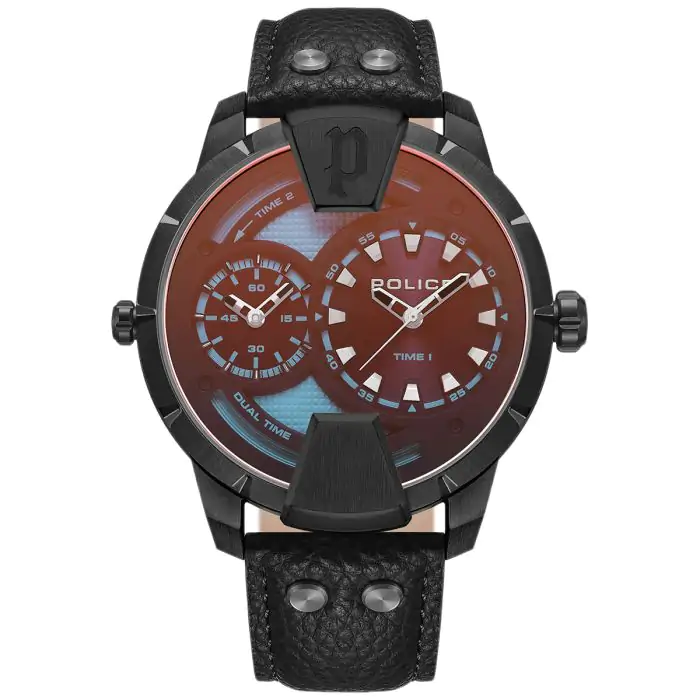 Zegarek Police PEWJA0022001 ma czarną tarczę z błyszczącym logo marki w kształcie litery P. Tarcza jest podzielona na dwie części, każda z nich ma osobny mechanizm i wskazuje czas w innym strefie czasowej. To idealne rozwiązanie dla podróżników i osób, które mają kontakt z ludźmi z różnych części świata. Tarcza jest chroniona przez mineralne szkiełko z efektem laserowym w kolorze pomarańczowym i niebieskim, które dodaje zegarkowi oryginalności i stylu.